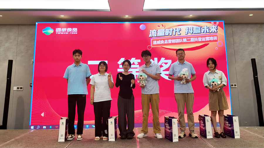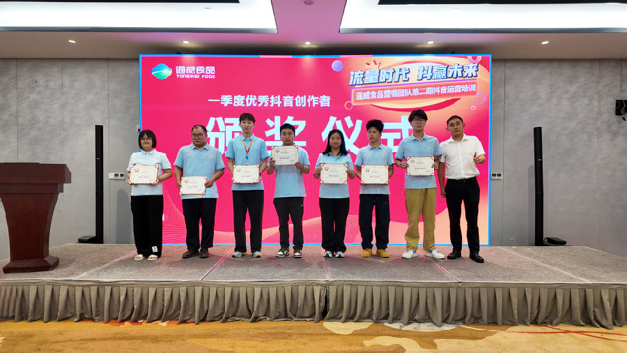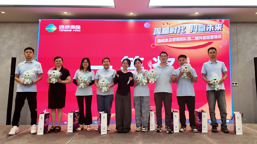培訓(xùn)開始前,根據(jù)營銷人員在2025年一季度抖音發(fā)布數(shù)量、咨詢數(shù)量、實(shí)際轉(zhuǎn)化銷量,評(píng)選出10名“優(yōu)秀抖音創(chuàng)作者”,通威食品副總經(jīng)理薛峰對(duì)獲獎(jiǎng)人員進(jìn)行現(xiàn)場(chǎng)頒獎(jiǎng)。